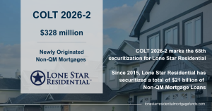 Lone Star Residential has closed its $328 million Non-QM securitization, COLT 2026-2. This deal marks the 68th securitization for Lone Star Residential’s COLT shelf, representing an aggregate of $21 billion of Non-QM mortgage loans securitized since 2015.